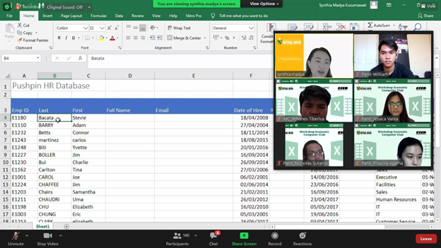 Melalui workshop online ini yang bertemakan “How to Improve Your Basic Microsoft Excel Skills?” diharapkan mahasiswa dan mahasiswi yang hadir dapat menambah ilmu dan wawasannya dalam memanfaatkan Microsoft Excel sebagai media pendukung dalam melakukan kegiatan yang berkaitan.